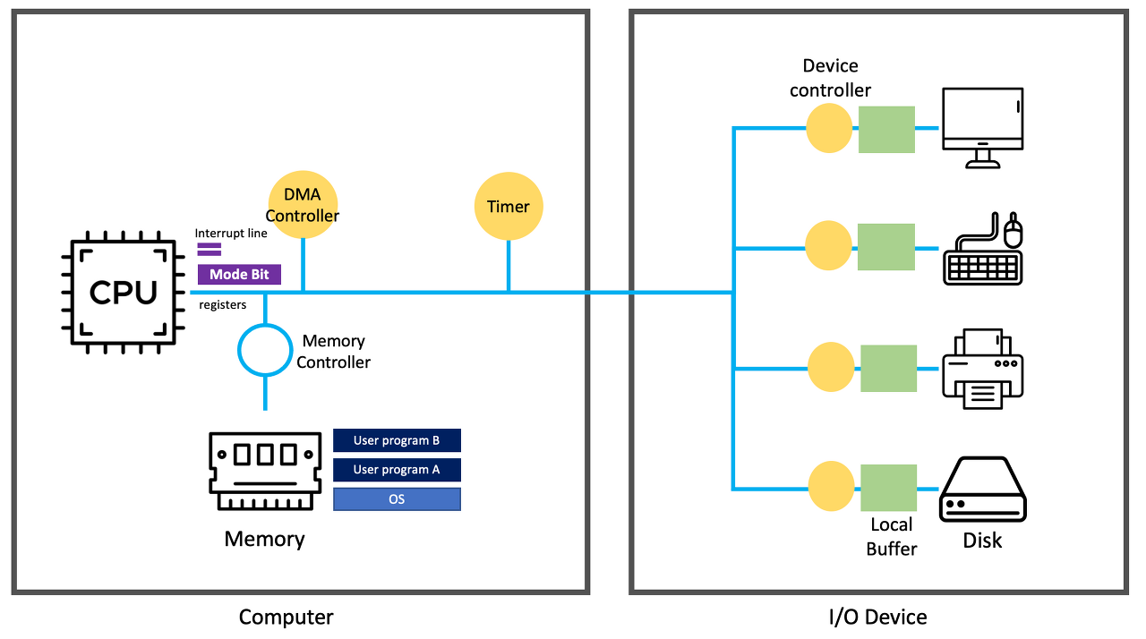 – cpu안에는 memory보다 빠른 저장 공간이 있음. 이를 register라고 함. - Interrupt line은 항상 프로그램이 memory 영역만을 사용해서 작동하기는 어렵기 때문에, I/O device 접근을 위해 프로그램 실행 중 interrupt를 걸어 해당 device에서 데이터를 읽거나 쓴다.