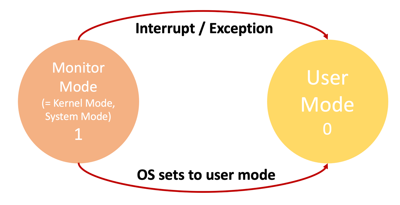 - interrupt나 exception 발생 시 하드웨어가 mode bit을 0으로 바꿈