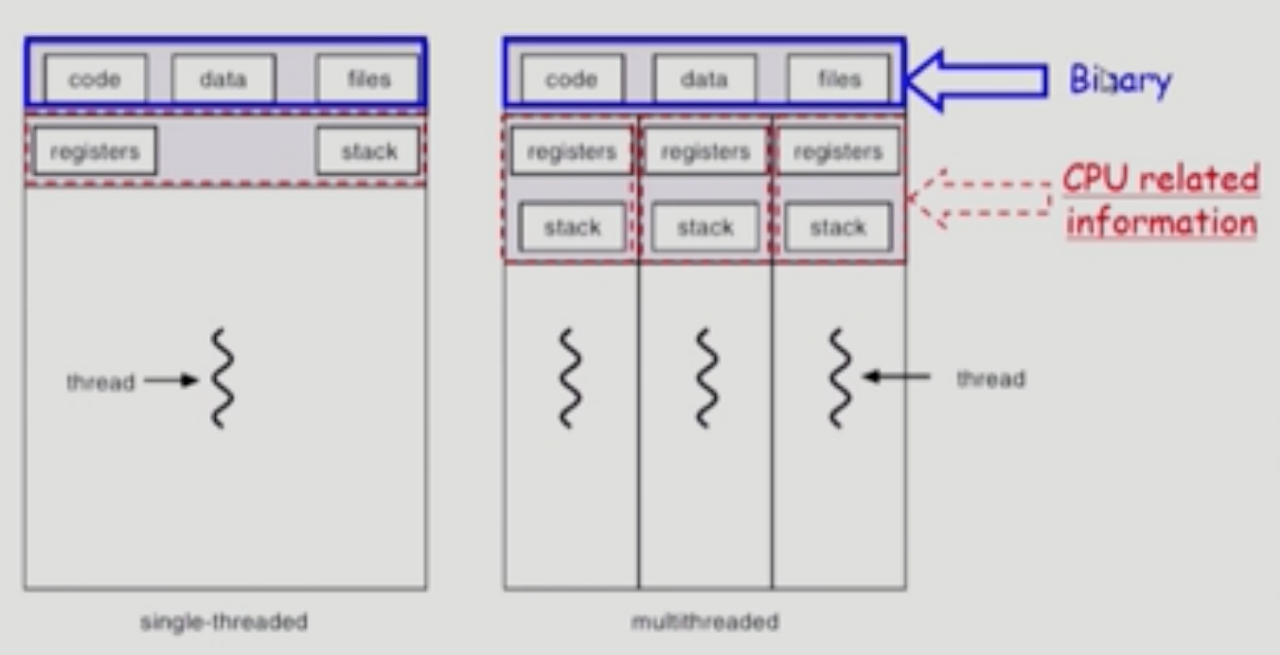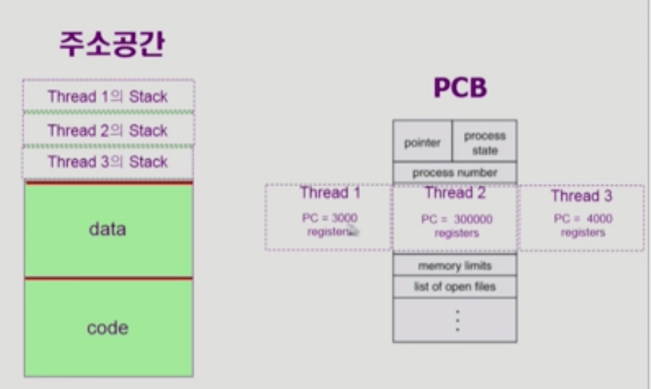 - PCB에서도 Thread 각각이 독립적으로 구성하고 있는 것은 PC(Program counter), Register이며 나머지 공간은 Thread끼리 서로 공유.
