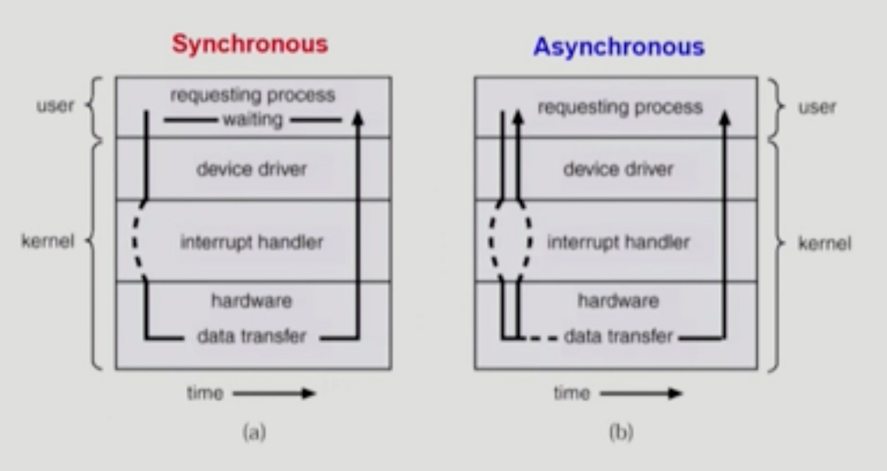 - 입출력을 요청한 프로세스가 종료시까지 대기하지 않고 CPU가 새로운 instruction를 실행할 경우 비동기식 입출력.