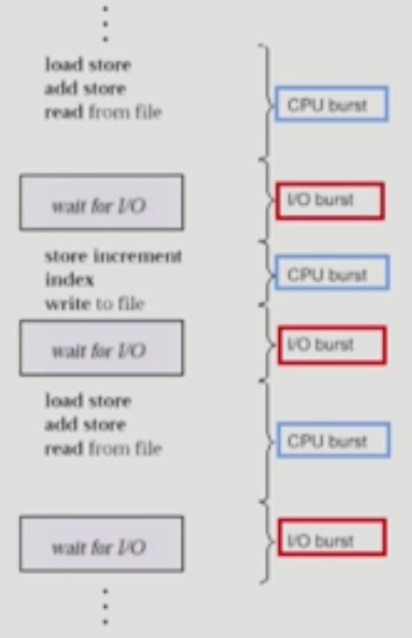 - CPU만 연속적으로 사용하는 CPU burst 상태와 I/O만 연속되어 발생하는 I/O Burst 상태가 반복되게 됨.