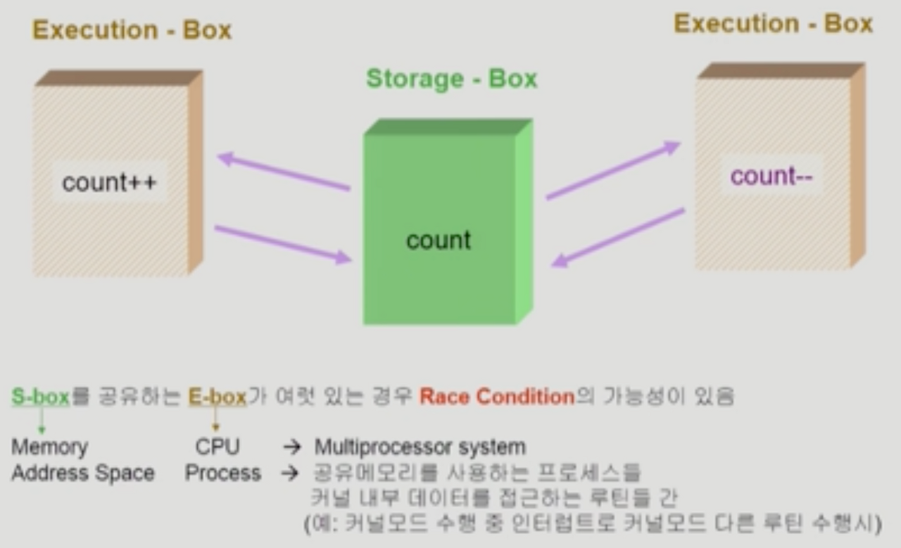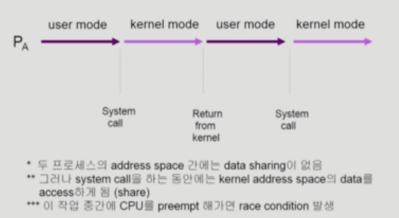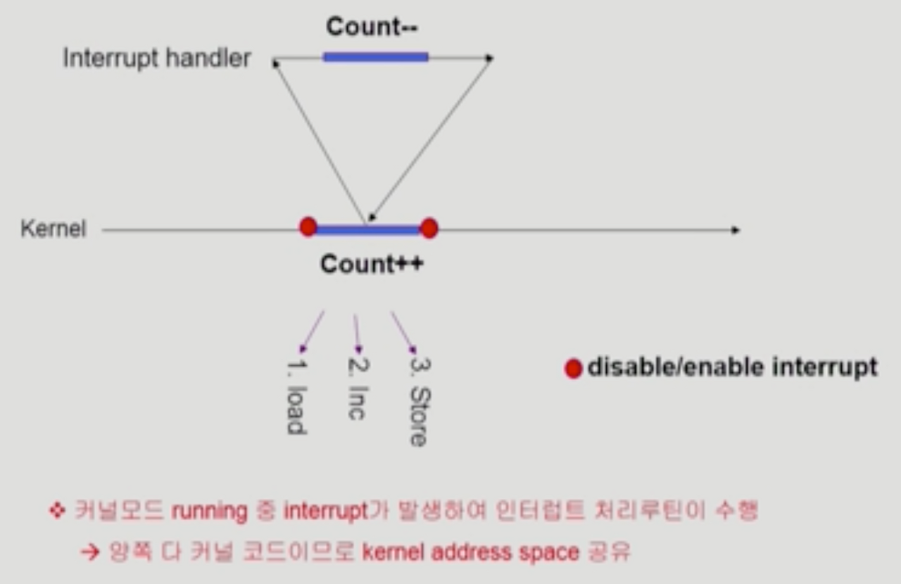- 중요한 변수값을 kernel이 처리하는 경우 interrupt 처리를 disable 시켜서 kernel이 수행하는 프로세스가 종료된 후 interrupt를 처리하는 방식으로 문제를 주로 해결함.