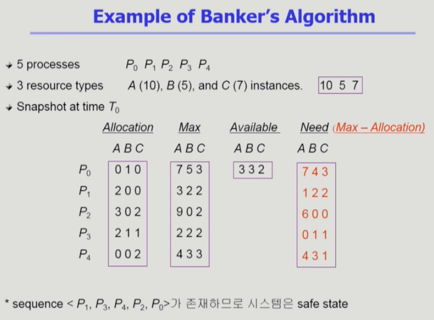 - 프로세스의 sequence <p1, p2, p3 ... pn>이 safe하려면 Pi(1 <= i <= n)의 자원 요청이 가용 자원 + 모든 Pj(j < i)의 보유 자원 에 의해 충족되어야 함.