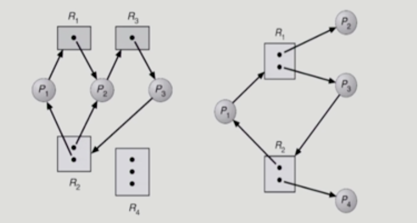 - 두번째 그림은 인스턴스가 여러개지만, cycle이 2개고 요청한 프로세스가 다 대기상태이므로 교착상태임.