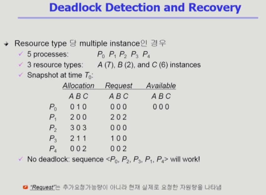 - Deadlock 발생은 허용하되 그에 대한 detection 루틴을 두어 deadlock 발견 시 recover