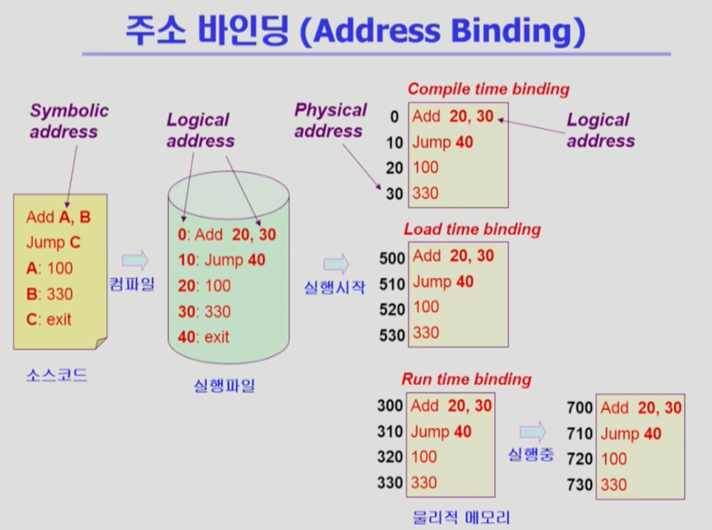 - Symbolic Address에서 Logical, Physical Address로 컴파일 되는 것.