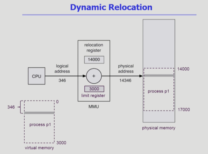 - relocation register, limit register 이렇게 두개의 레지스터로 주소 변환을 도와준다.