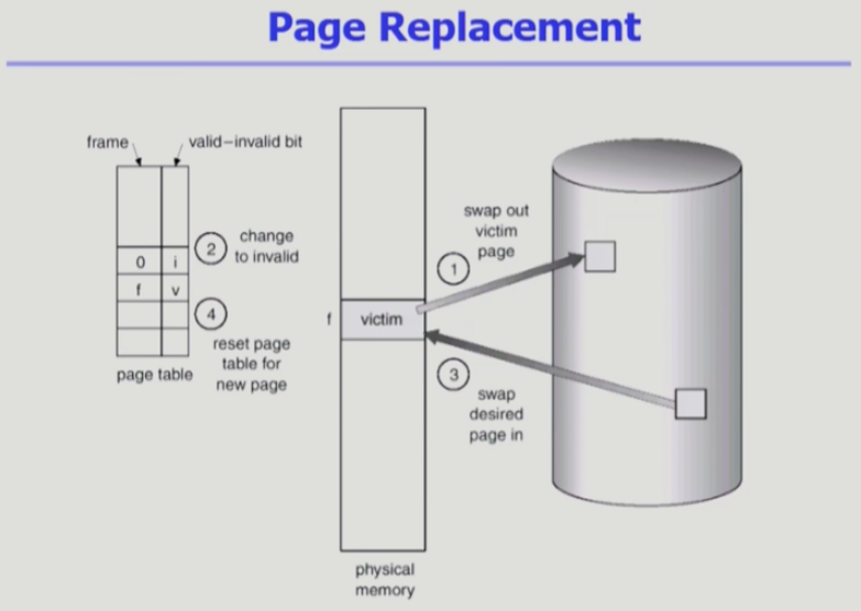 - 쫓아내고 빈 자리에 새로운 page를 올려준다. 페이지 테이블에 frame number를 적고, valid로 바꿔준다.