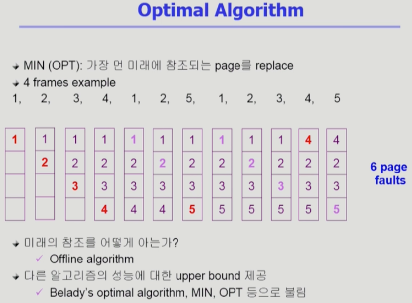 - 페이지 폴트를 가장 적게하는 알고리즘. 하지만, 미래의 일을 예측할 수 없기 때문에 이론적인 알고리즘임.