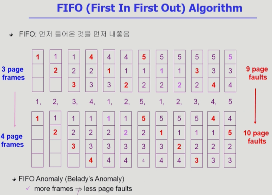 - 동일한 페이지가 여러 번 메모리에서 쫒겨났다가 다시 들어올 수 있음.
