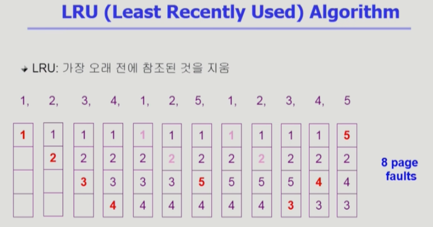 - 가장 오래 전에 참조된 것을 지우고 최근에 쓰인 것은 남기는 것. 최근에 쓰인 페이지가 또 쓰일 것이라고 가정하는 알고리즘.