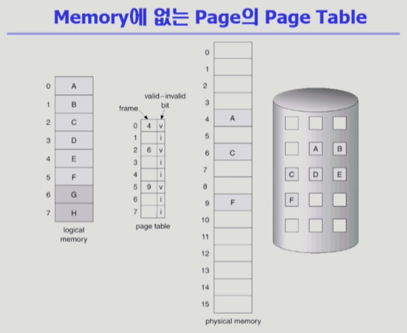 => 물리적 메모리에 올라와 있지 않은 페이지를 나타냄! - A,C,F는 물리 메모리에 올라와있어서 v로 표시되어 있고, 나머지 페이지들은 사용하는 페이지이긴 하지만 현재는 백킹스토어(swap area)에 내려가 있어서 i로 표시되어 있다.