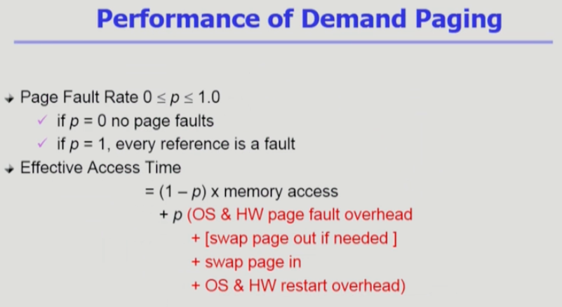 = (1-p) * memory access + p ( OS & HW page fault overhead + 공간 없을때 내쫓기[swap page out if needed] + swap page in + (나중에 CPU얻으면 restart) OS & HW restart overhead ) - 그러므로 페이지가 부재하면 오버헤드가 발생함.