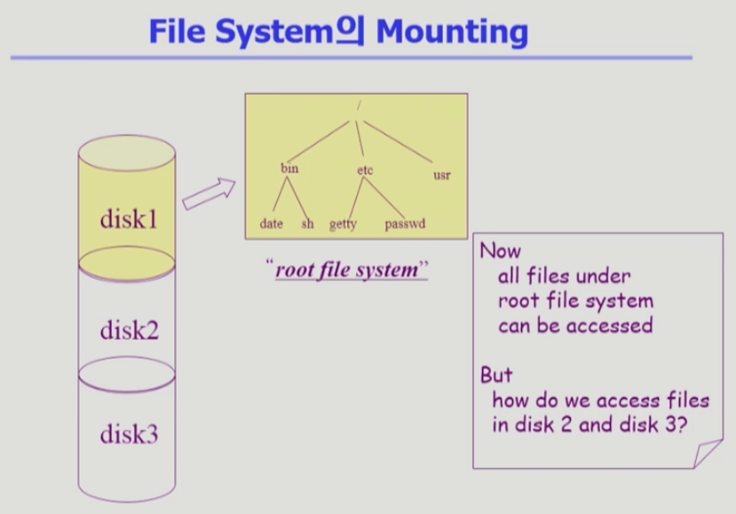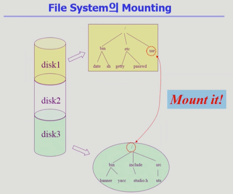 - 마운트를 하게 되면 또 다른 파일 시스템의 root를 연결할 수 있음.