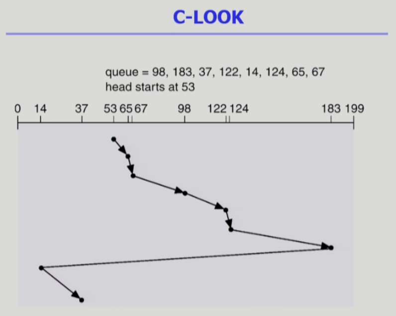 - SCAN, C-SCAN 및 그 응용 알고리즘은 LOOK, C-LOOK 등이 일반적으로 디스크 입출력이 많은 시스템에서 효율적인 것으로 알려져 있음.