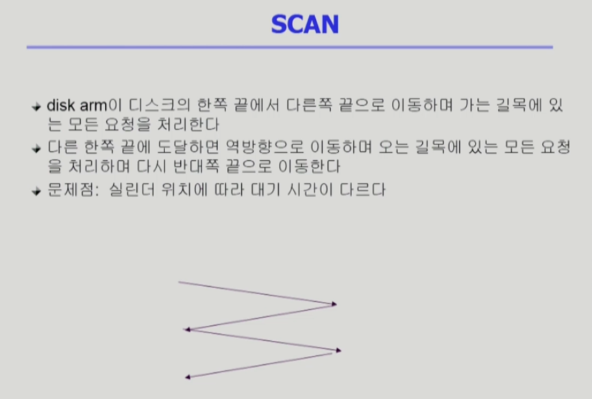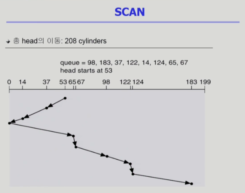 - SCAN이나 C-SCAN은 헤드가 디스크 끝에서 끝으로 이동