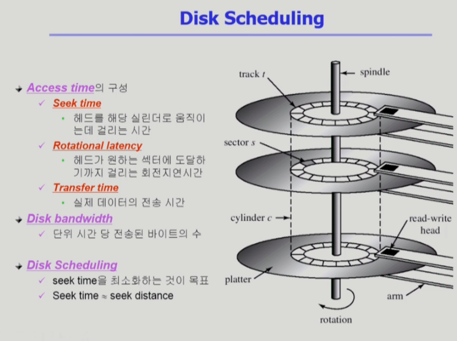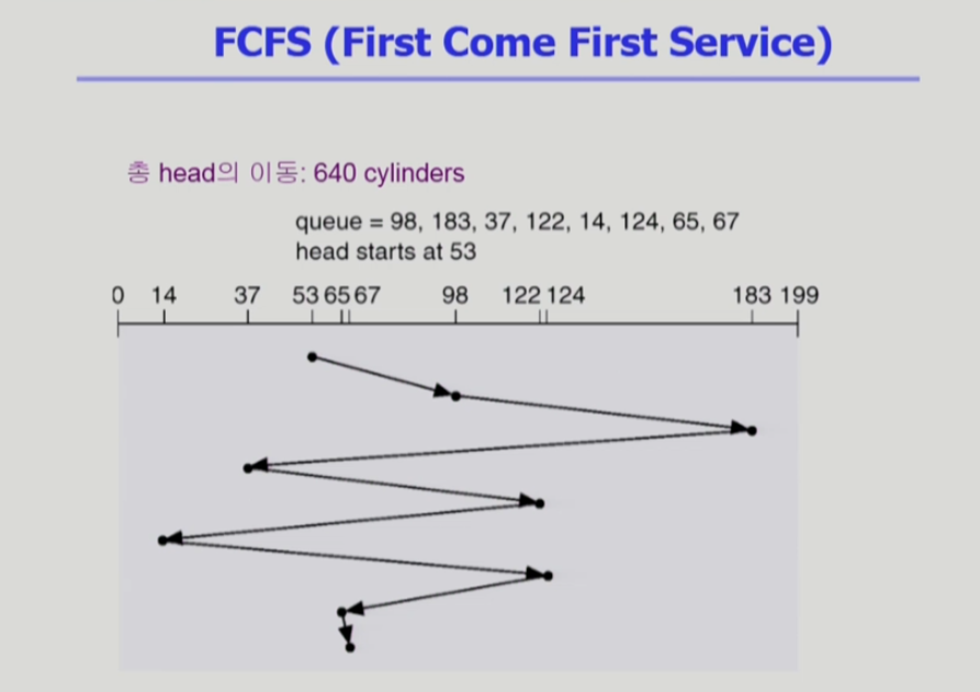 - seek time을 최소화하는 것이 목표 (디스크 접근 시간이 거의 seek time에 따라 좌우되기 때문에)