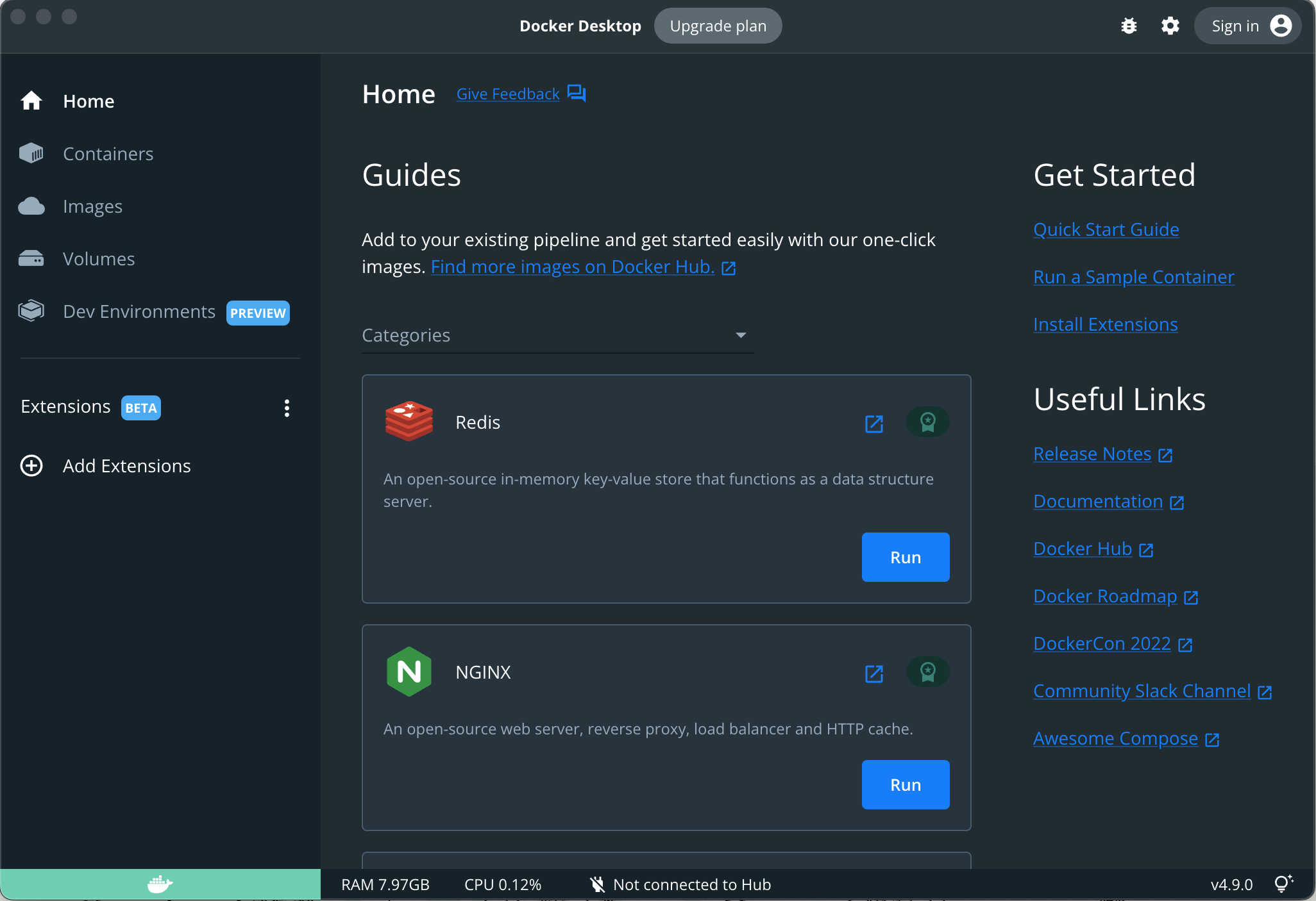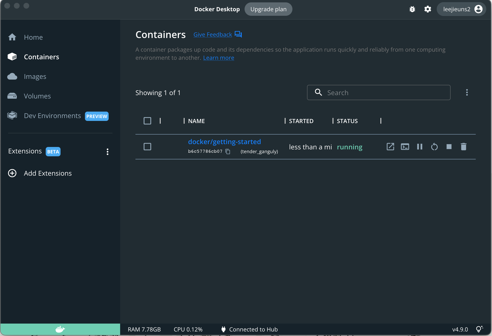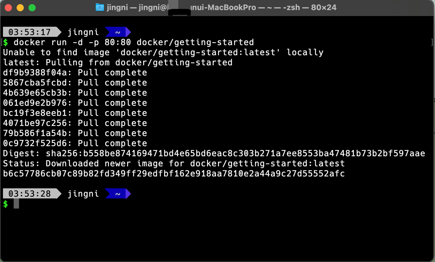 해당 명령어를 Copy & Paste해서 MacOS terminal 에서 실행시켜주면 바로 아래와 같이 container가 생성되는 것을 확인할 수 있다.