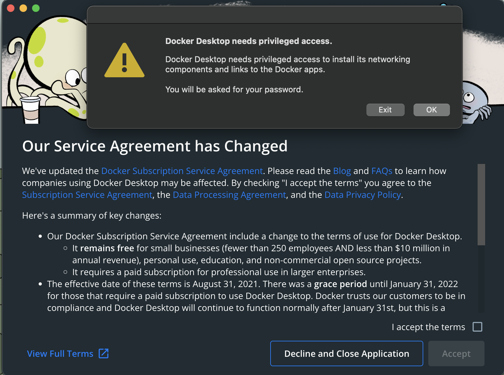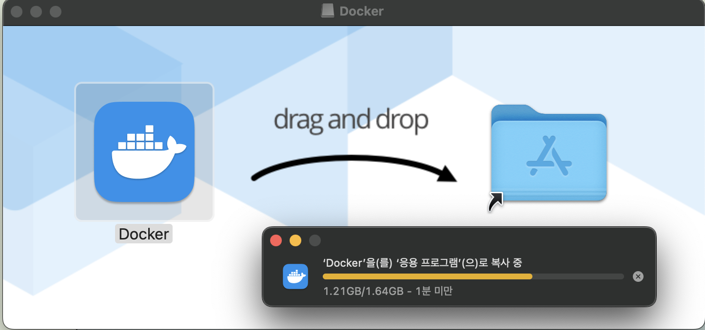 클릭 후 다운받은 dmg 파일을 실행시켜주면 본격적으로 Docker Desktop 다운로드가 시작된다.
