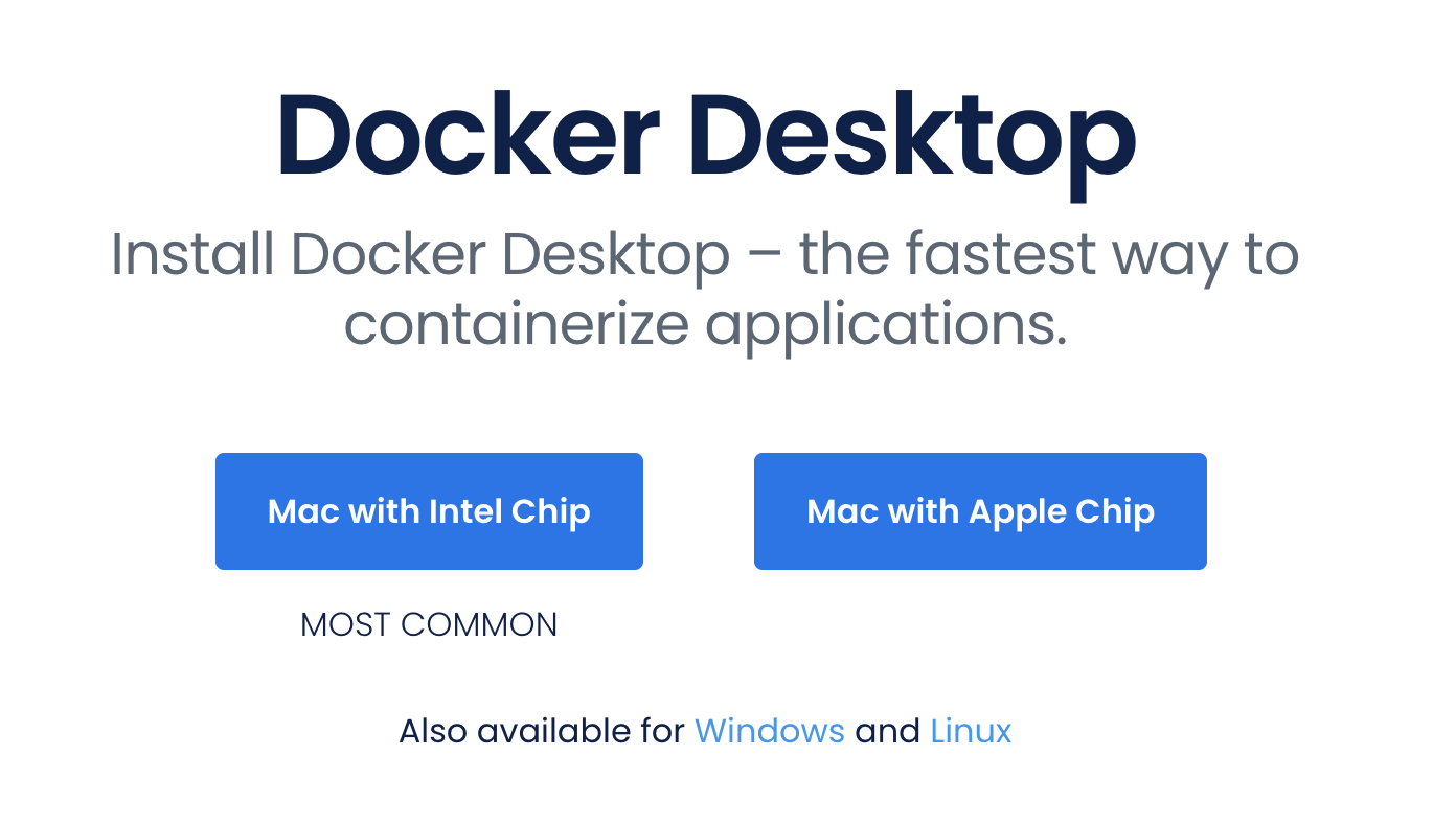 먼저 해당 페이지에 들어가 CPU Chip type을 선택해준다. 나의 경우 Intel 맥북을 사용하기 때문에 intel chip을 선택했지만, 만약 M1,M2 칩의 맥북을 사용하는 경우 Apple chip을 선택해 다운로드 하면 될 것 같다. (흘려 듣기로는 M1칩에서 도커 관련 이슈가 있다고 들었는데 지금 해결되었는지는 모르겠다.)
