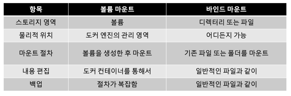 - 도커 엔진이 관리하는 영역 내에 만들어진 볼륨을 컽네이너에 디스크 형태로 마운트함.