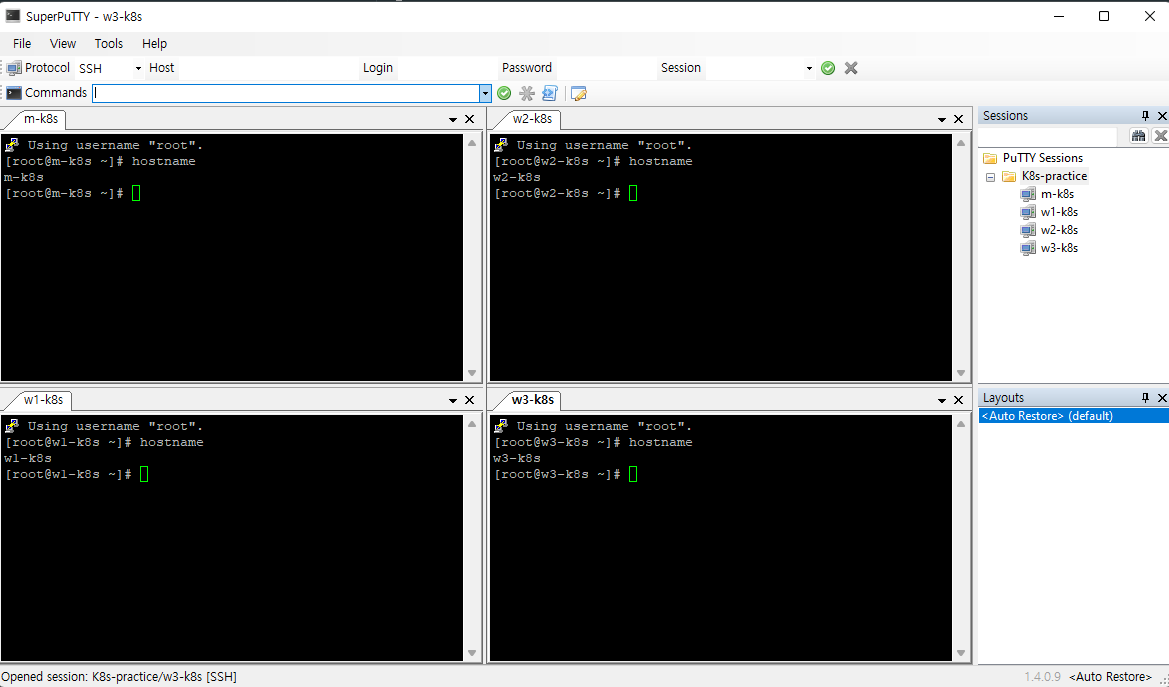 - 최종적으로 설정한 값들이 적용되어 네트워크가 잘 되는지 확인하기 위해 SuperPutty 를 통해 4개의 가상머신에 접속