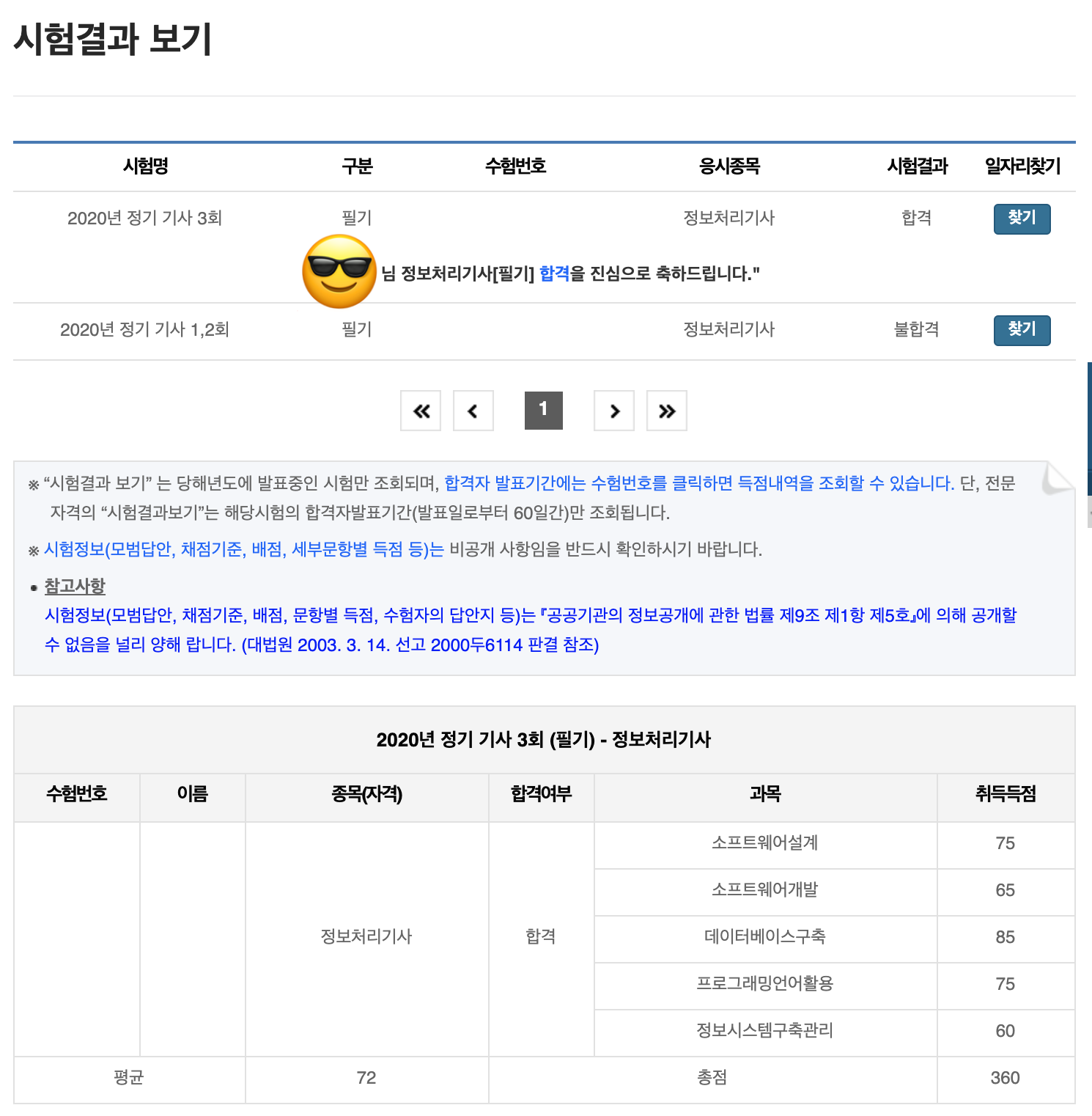 어제인 2020년 9월 3일이 2020년 3회 정보처리기사 필기 합격 발표날이었어요 !!