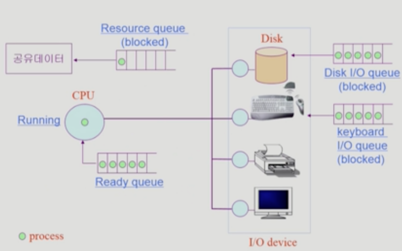 - CPU는 여러 프로세스가 공유하기 때문에 계속 Ready Queue에서 Process가 대기하고 있다가 점유하는 방식으로 작동함.