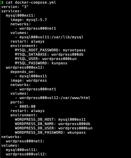 $ docker run --name wordpress000ex12 -dit --net=wordpress000net1 -p 8085:80 -e WORDPRESS_DB_HOST=mysql000ex11 -e WORDPRESS_DB_NAME=wordpress000db -e WORDPRESS_DB_USER=wordpress000kun -e WORDPRESS_DB_PASSWORD=wkunpass wordpress
